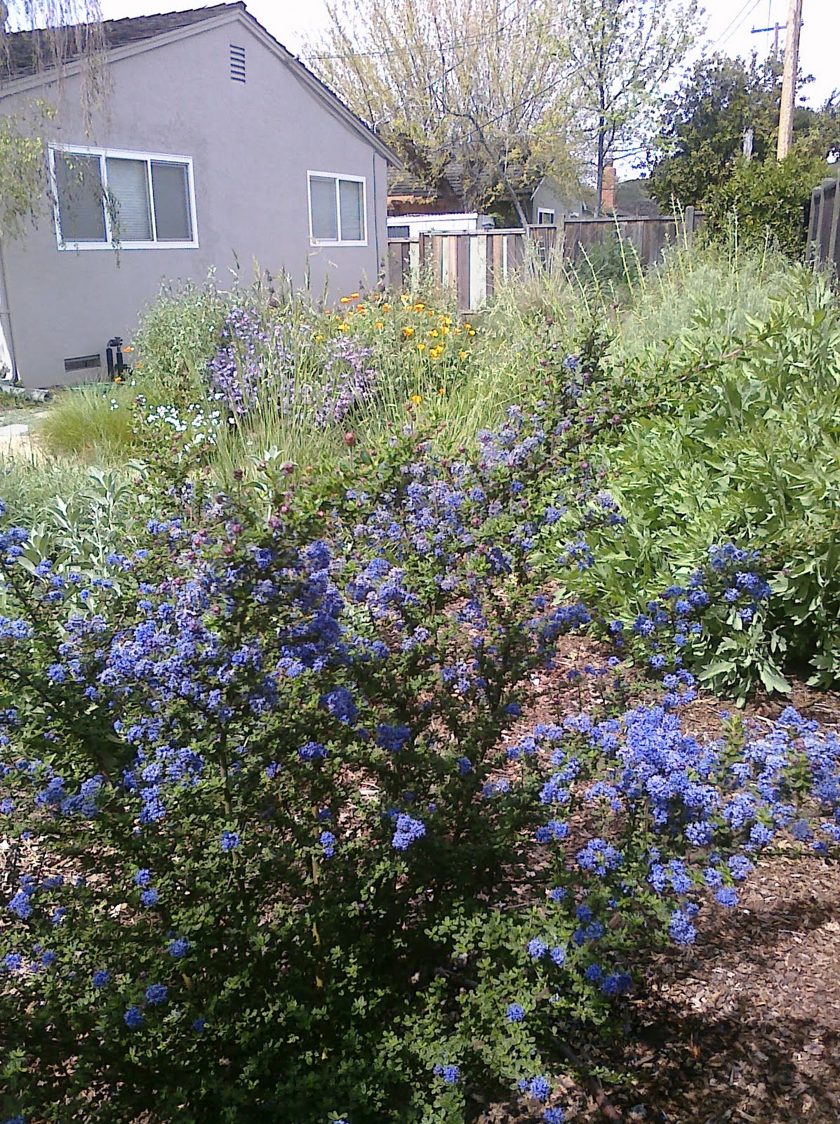 Patio view, April 2010. A young Dark Star Ceanothus explodes with color late Winter through Spring.